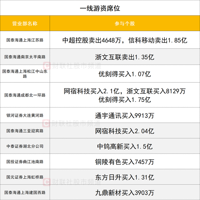 一线游资活跃度较高,网宿科技获两家一线游资(国泰海通证券成都北一环路、国泰海通证券三亚迎宾路)合计买入4.14亿。