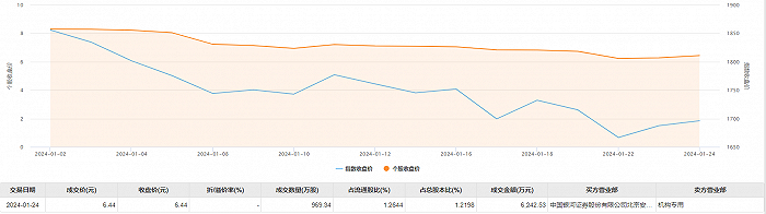 今日大宗交易成交969.34万股,成交额6242.53万元,占当日总成交额的29.84%,成交价6.44元,较市场收盘价持平。