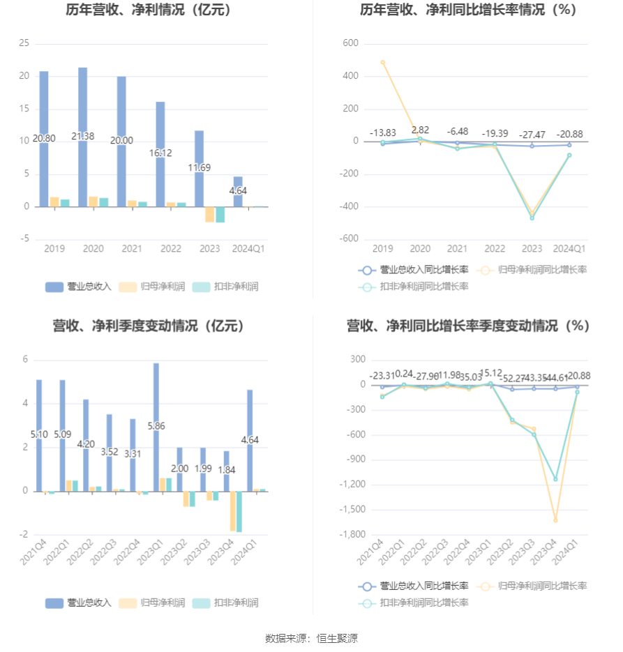 2024年第一季度,公司毛利率为18.04%,同比下降7.79个百分点;净利率为2.21%,较上年同期下降7.99个百分点。