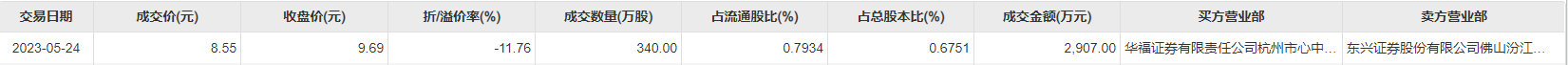 5月24日大宗交易成交340万股,成交额2907万元,占当日总成交额的16.05%,成交价8.55元,较市场收盘价9.69元折价11.76%。