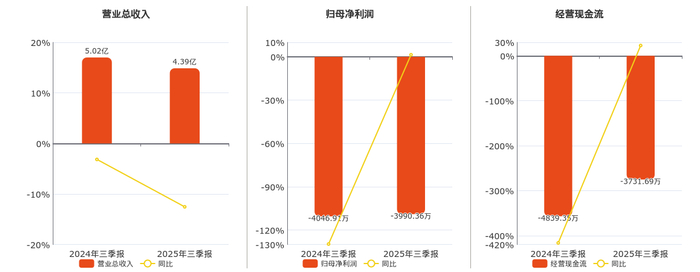 公司营业总收入为4.39亿元,较去年同报告期营业总收入减少6301.48万元,同比较去年同期下降12.54%。归母净利润为-3990.36万元。经营活动现金净流入为-3731.69万元。
