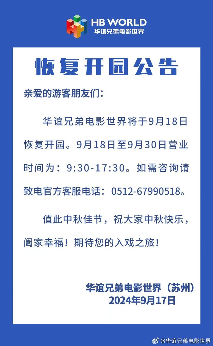 电影世界(苏州)宣布,华谊兄弟电影世界将于9月18日起恢复正常营业。