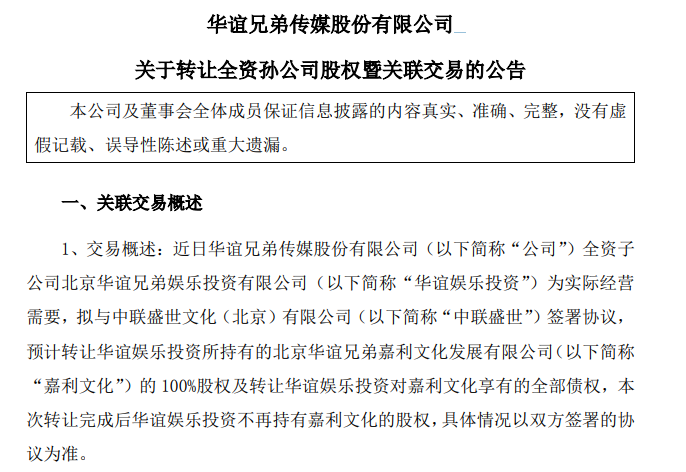 2023年11月,借款的五年之期将至,华谊兄弟公告将华谊娱乐投资持有的嘉利文化100%股权以及华谊娱乐对嘉利文化的全部债权(约1.3亿元)转让给中联盛世以抵销上述借款部分金额。转让股权及转让债权的转让价款共计为3.5亿元,而中联盛世为阿里创投的关联方。