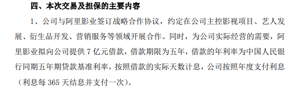 2019年1月,华谊兄弟公告,为了进一步支持公司生产经营资金的需要,阿里影业向公司提供7亿元借款,借款期限为五年。