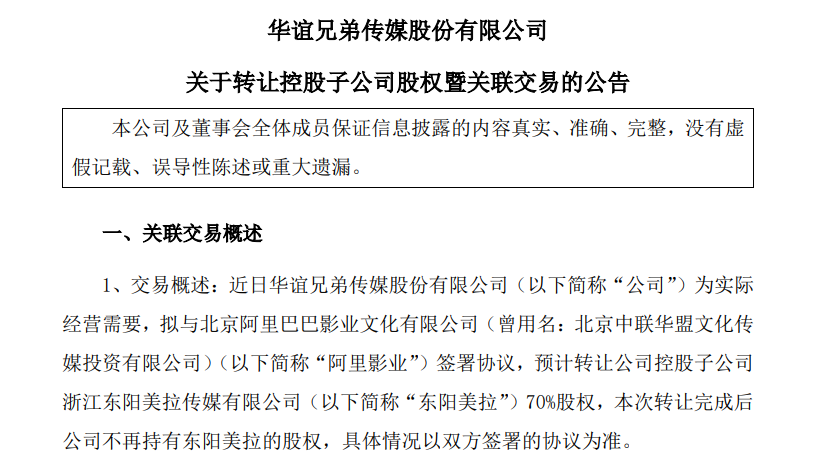 今年7月,华谊兄弟公告称,公司拟将控股子公司浙江东阳美拉传媒有限公司70%股权转让给北京阿里巴巴影业文化有限公司,股权转让价款为3.5亿元。