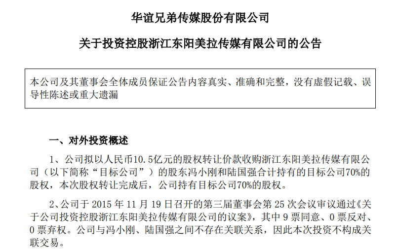 2015年11月,华谊兄弟发布公告称,拟以人民币10.5亿元的股权转让价款收购东阳美拉的股东冯小刚和陆国强合计持有的目标公司70%的股权,本次股权转让完成后,公司持有目标公司70%的股权。