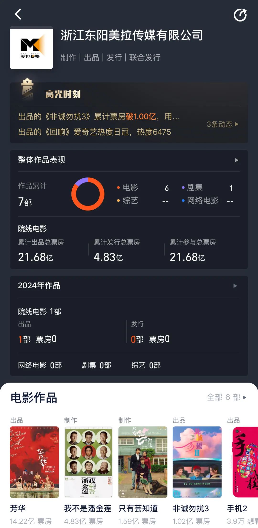 企查查显示,东阳美拉成立于2015年9月,注册资本500万元人民币,经营范围包含电子和数字媒体广告及影视广告、文艺表演、影视项目的投资管理等,现由阿里影业和冯小刚共同持股。