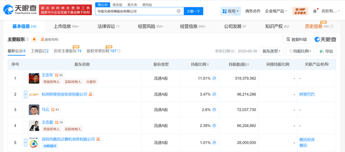 该公司成立于2004年11月,法定代表人为王忠军,注册资本约27.7亿人民币,经营范围含国产影片发行,摄制电影,企业形象策划,影视文化信息咨询服务,影视广告制作、代理、发行,影视项目的投资管理等。股东信息显示,该公司由王忠军、杭州阿里创业投资有限公司、马云、王忠磊等共同持股。
