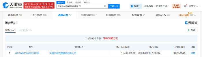 雷达财经讯,天眼查App显示,近日,华谊兄弟(300027)新增一则被执行人信息,执行标的1140万余元,执行法院为北京市朝阳区人民法院。