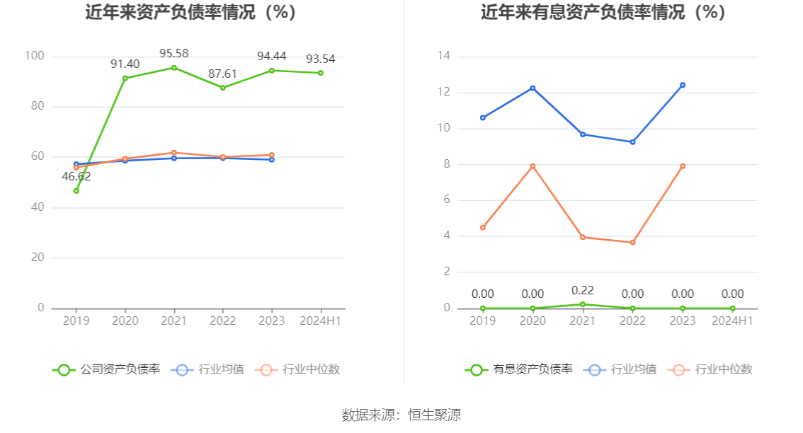 在偿债能力方面,公司2024年上半年末资产负债率为93.54%,相比上年末下降0.90个百分点;有息资产负债率为0.00%,相比上年末基本持平。
