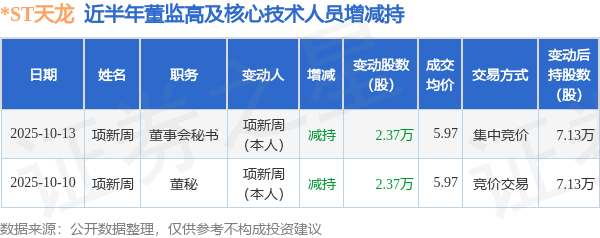 *ST天龙:10月10日高管项新周减持股份合计2.37万股