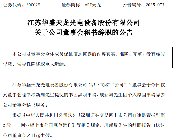 一个有意思的细节是,《星岛》查询发现,就在一天前,*ST天龙刚发布一则《关于公司董事会秘书辞职的公告》,公司称,11月20日收到董事会秘书项新周先生提交的书面辞职申请,其因个人原因申请辞去董事会秘书职务。