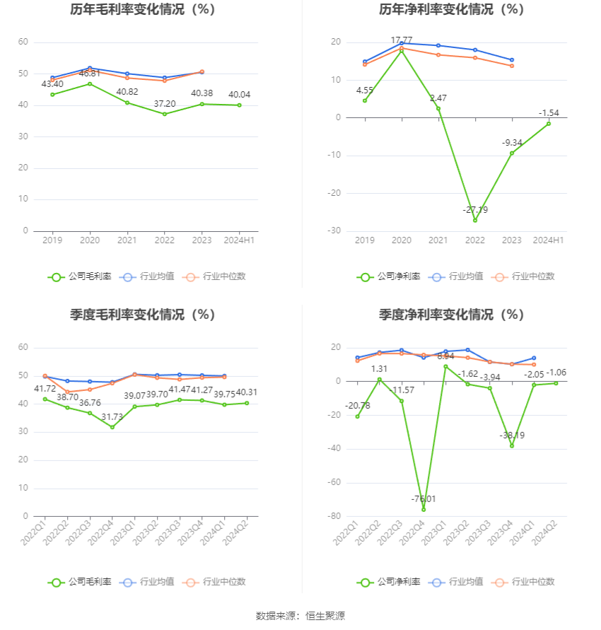 2024年上半年,公司毛利率为40.04%,同比上升0.65个百分点;净利率为-1.54%,较上年同期下降5.15个百分点。从单季度指标来看,2024年第二季度公司毛利率为40.31%,同比上升0.61个百分点,环比上升0.56个百分点;净利率为-1.06%,较上年同期上升0.56个百分点,较上一季度上升0.99个百分点。