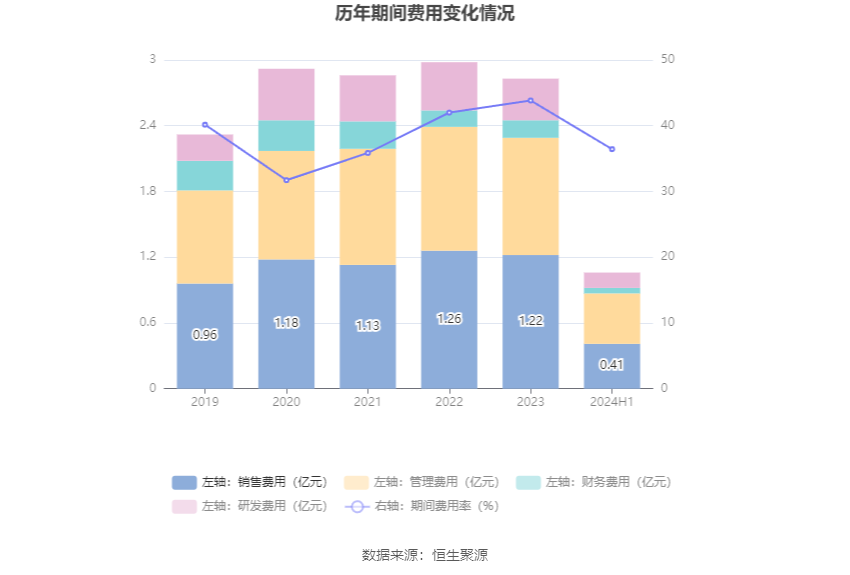 2024年上半年,公司期间费用为1.07亿元,较上年同期减少1587.82万元;期间费用率为36.44%,较上年同期下降1.93个百分点。其中,销售费用同比下降18.63%,管理费用同比下降1.81%,研发费用同比下降21.53%,财务费用同比下降24.8%。
