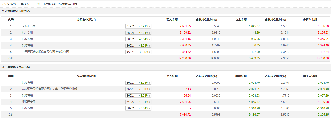 宝通科技12月22日跌16%,全天换手率达16.84%,振幅达19.91%。龙虎榜数据显示,营业部席位合计净买入5757.32万元。其中,机构买入7788.37万元,卖出7154.88万元,合计净买入633.48万元。此外,光大证券(维权)汕头华山路证券营业部、深股通专用分别卖出2071.61万元、1845.87万元;深股通专用、中国国际金融上海分公司分别买入7601.95万元、1844.32万元。