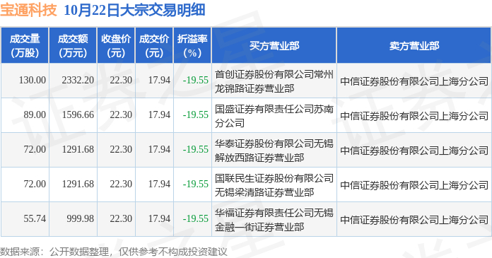 10月22日宝通科技现5笔折价19.55%的大宗交易 合计成交7512.2万元