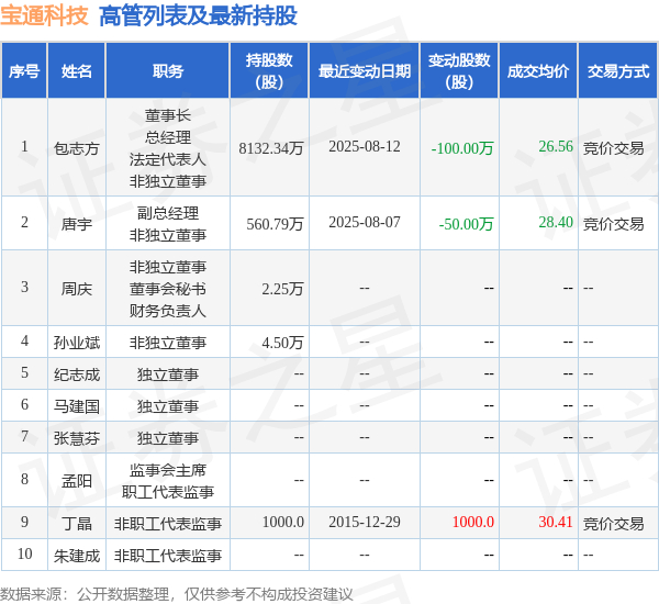 宝通科技近半年内的董监高及核心技术人员增减持详情如下: