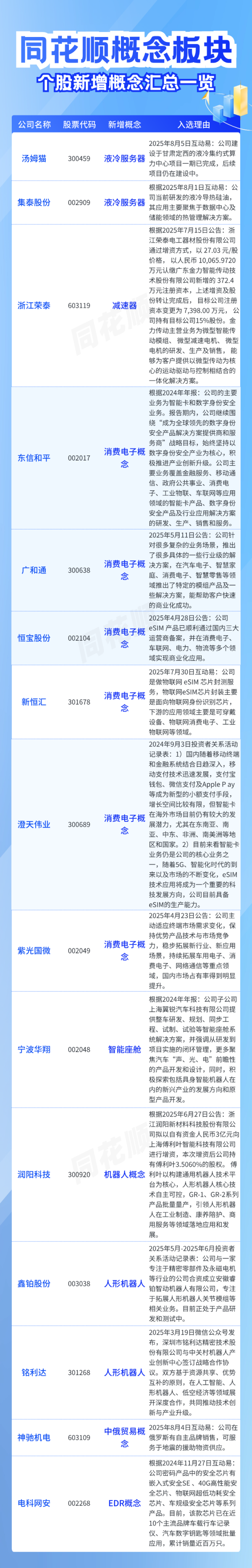 在已有概念板块中,共有41只个股有新增概念。其中,液冷服务器概念新增2只个股,减速器概念新增1只个股,消费电子概念概念新增6只个股,智能座舱概念新增1只个股,机器人概念概念新增1只个股,人形机器人概念新增2只个股。