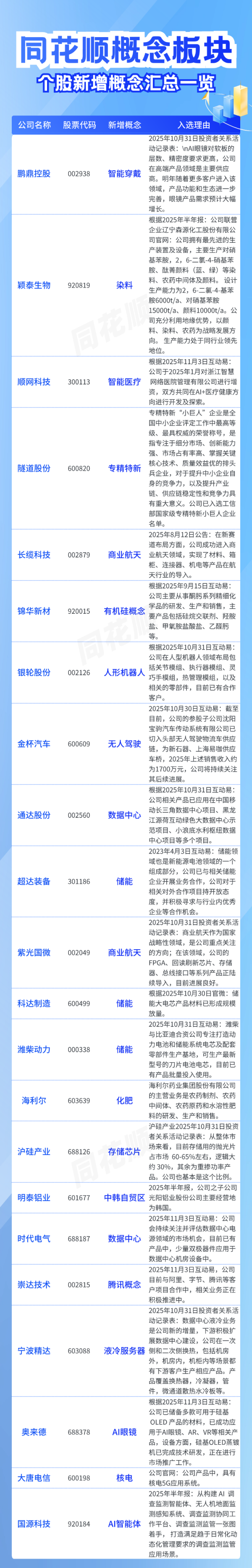 概念速报|同花顺概念板块个股新增概念汇总一览(11月03日)