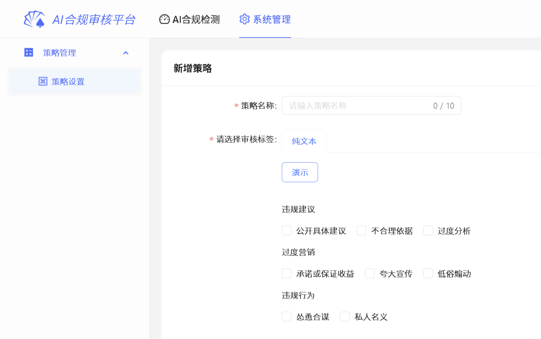 以“模型能力精准服务”为核心,针对投顾观点、策略周报等文本内容,不仅内置违规建议、过度营销等二十余种审核策略,还可根据机构自身合规要求灵活配置,支持定制化策略接入。