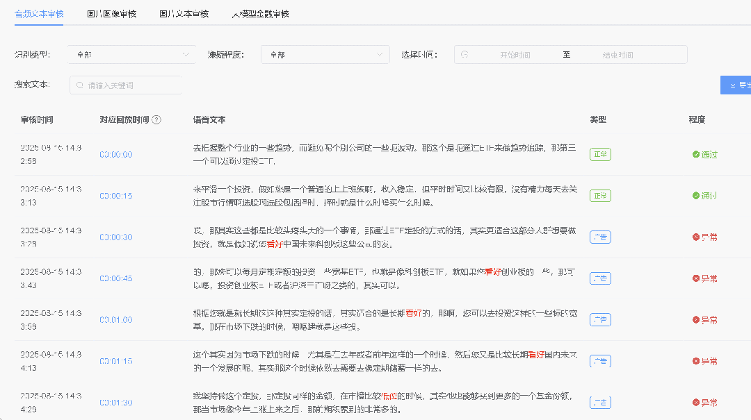 彻底解决视频、音频、图片的审核难题——音频实时转写、视频帧级识别、图片文字提取,无论是投顾直播的即兴发言,还是配图中的隐性信息,都能被精准捕捉并完成审核。此外,方案还特别针对直播场景,提供大屏监控功能,赋能合规审核工作提质增效,从容应对直播业务增长与监管挑战。