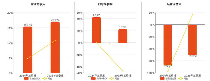 公司营业总收入为28.04亿元,较去年同报告期营业总收入增加2.71亿元,实现5年连续上涨,同比较去年同期上涨10.69%。归母净利润为1.25亿元,较去年同报告期归母净利润减少1.10亿元,同比较去年同期下降46.97%。经营活动现金净流入为-2.83亿元,较去年同报告期经营活动现金净流入增加9250.65万元。