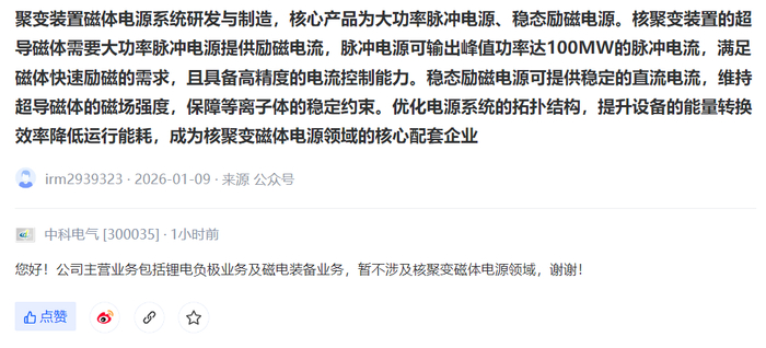 V观财报|中科电气:暂不涉及核聚变磁体电源领域