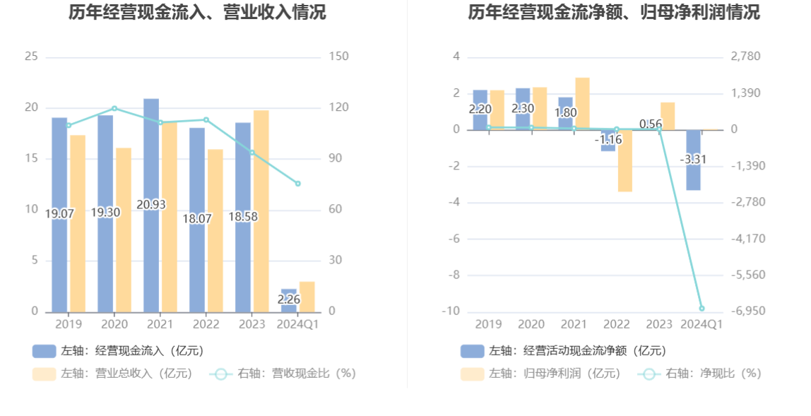 2024年第一季度,公司营业收入现金比为75.62%,净现比为-6812.72%。