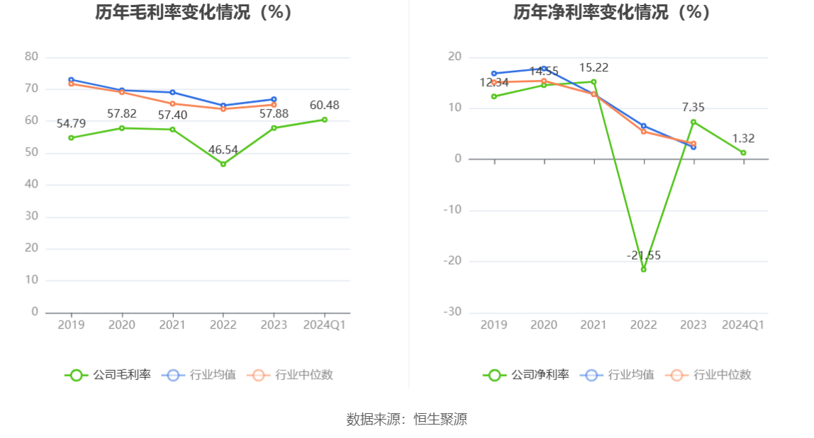 2024年第一季度,公司毛利率为60.48%,同比上升0.94个百分点;净利率为1.32%,较上年同期下降2.08个百分点。