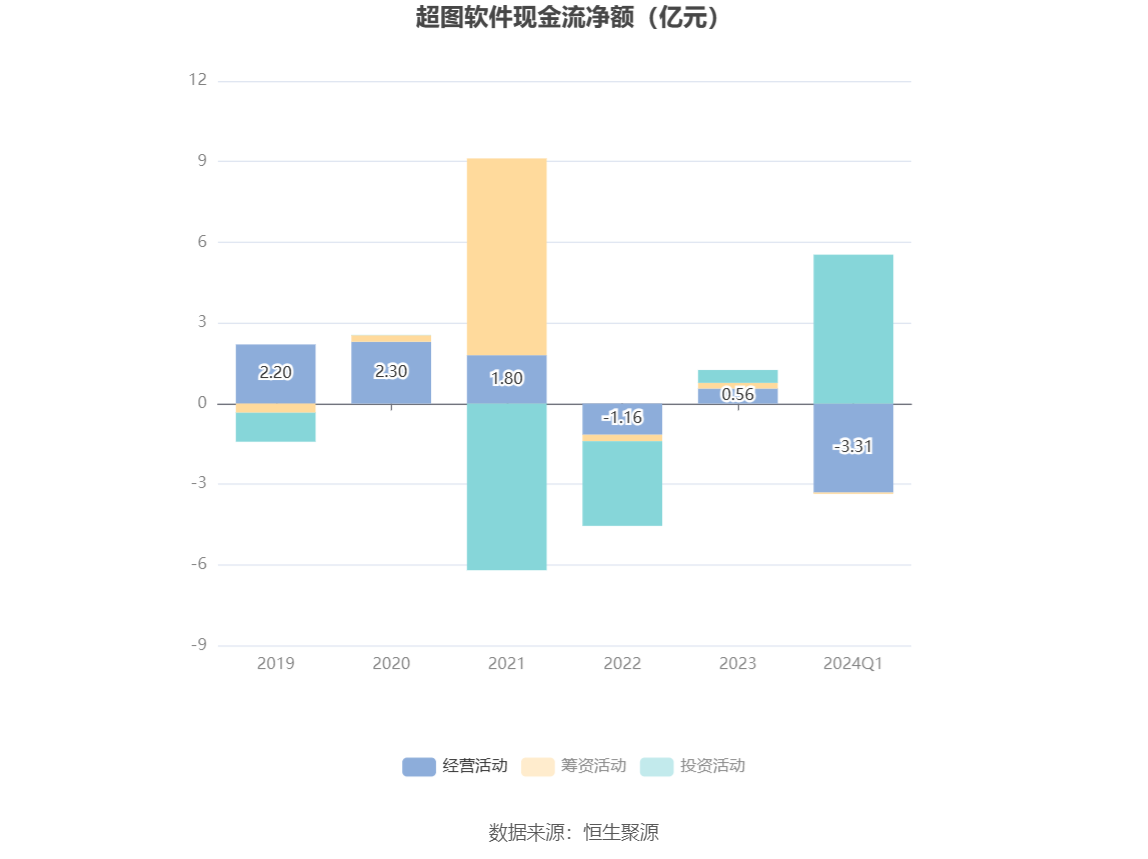 2024年第一季度,公司经营活动现金流净额为-3.31亿元,同比减少3444.82万元;筹资活动现金流净额-507.73万元,同比减少5582.84万元;投资活动现金流净额5.54亿元,上年同期为-4191.66万元。