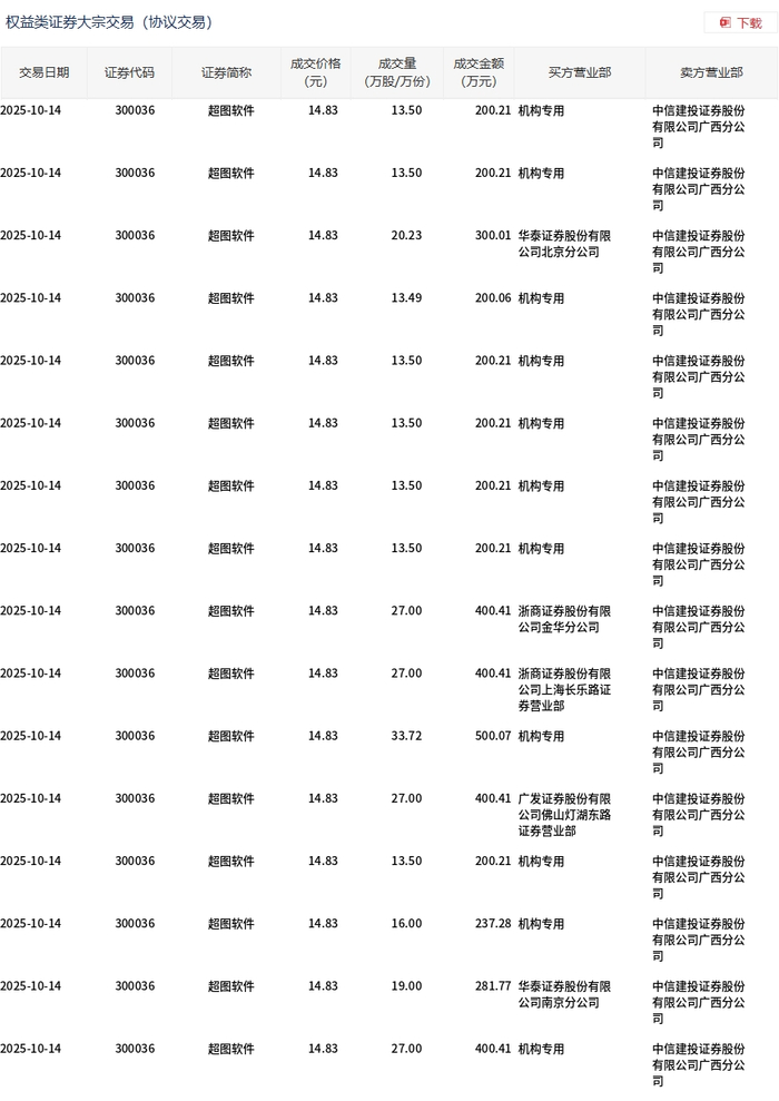 10月14日,超图软件大宗交易成交304.94万股,成交额4522.3万元,占当日总成交额的15.49%,成交价14.83元,较市场收盘价16.95元折价12.51%。