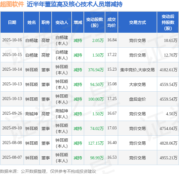 超图软件近半年内的董监高及核心技术人员增减持详情如下:
