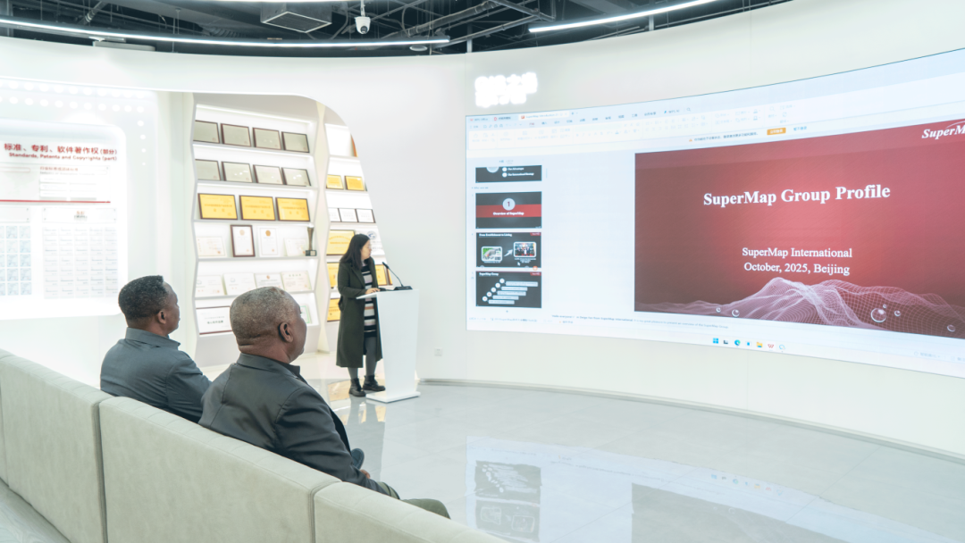 ▲Samuel Larbi Darko博士(中)、Surv. Stephen Djaba(左)到访超图软件超图软件国际大区解决方案工程师陈明娥向加纳代表团介绍了超图空间智能软件技术的创新成果与解决方案,重点阐述了SuperMap GIS在跨平台、三维、大数据等方面的技术突破,并结合案例,展示了在智慧城市、地籍管理等领域的落地应用。Samuel主席对超图软件的技术实力表示赞赏。他指出,GIS技术在非洲基础设施建设与可持续发展中扮演着关键角色,期待与超图软件共同探索技术落地路径,推动加纳及非洲测绘地理信息行业的数字化转型与升级。