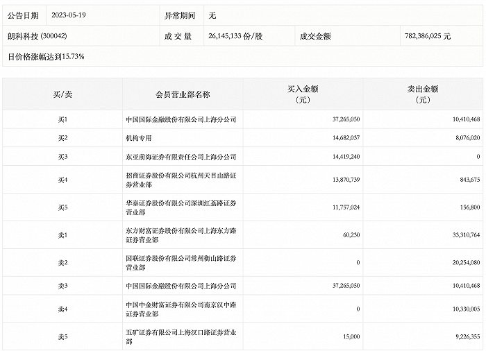 5月19日,朗科科技今日涨15.73%,龙虎榜数据显示,上榜营业部席位全天成交1.85亿元,占当日总成交金额比例为23.6%。其中,买入金额为9206.93万元,卖出金额为9260.82万元,合计净卖出53.88万元。