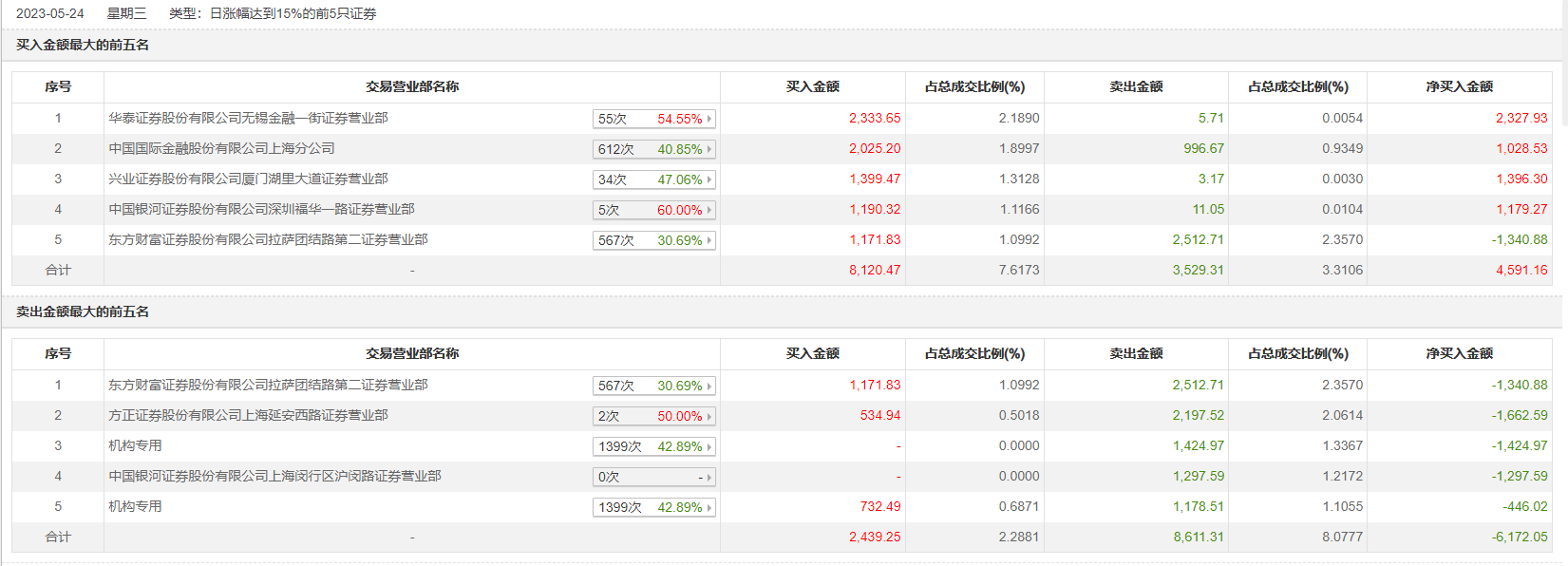 5月24日,朗科科技今日涨停,龙虎榜数据显示,上榜营业部席位全天成交1.9亿元,占当日总成交金额比例为17.84%。其中,买入金额为9387.89万元,卖出金额为9627.91万元,合计净卖出240.02万元。