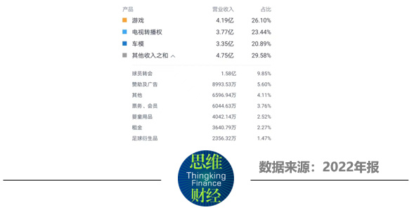 年报显示,星辉娱乐2022年主营收入为16.06亿元,其中车模收入3.35亿元,占比21%;游戏收入为4.19亿元,占比26%;包括电视转播权、球员转会、赞助广告、票务会员、足球衍生品在内的足球俱乐部收入超过7亿元,占比超过45%。