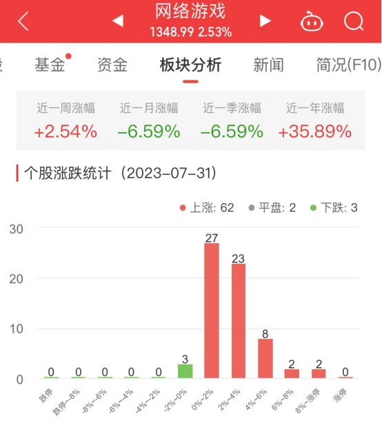 中国经济网北京7月31日讯今日,网络游戏板块整体涨幅2.53%,其中62只股票上涨,2只股票平盘,3只股票下跌。