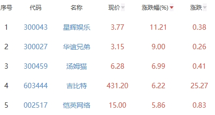 其中,星辉娱乐、华谊兄弟、汤姆猫、吉比特、恺英网络位列板块涨幅前五位,涨幅分别为11.21%、9.00%、6.99%、6.22%、5.86%。