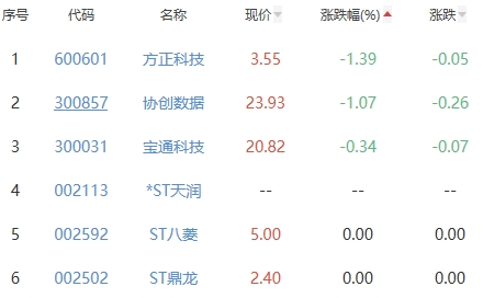 方正科技、协创数据、宝通科技、ST八菱、ST鼎龙位列涨幅榜后五位,涨幅分别为-1.39%、-1.07%、-0.34%、0.00%、0.00%。