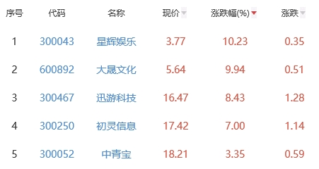 其中,星辉娱乐、大晟文化、迅游科技、初灵信息、中青宝位列板块涨幅前五位,涨幅分别为10.23%、9.94%、8.43%、7.00%、3.35%。
