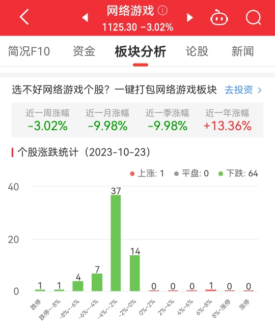 中国经济网北京10月23日讯今日,网络游戏板块整体跌幅3.02%,其中1只股票上涨,64只股票下跌。