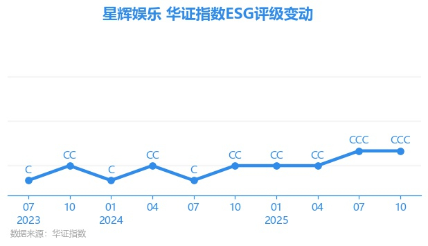 日前,华证指数公布了新一期(2025年10月31日)的ESG评级结果,星辉娱乐(300043.SZ)获得CCC评级(华证指数评级为C起至AAA九档,C为最低档,AAA为其最高一级评级/AA为其第二档),上一期(2025年7月31日)ESG评级为CCC。本期ESG评级在30家休闲设备与用品行业A股上市公司中排名第19(上一期排名第23)。