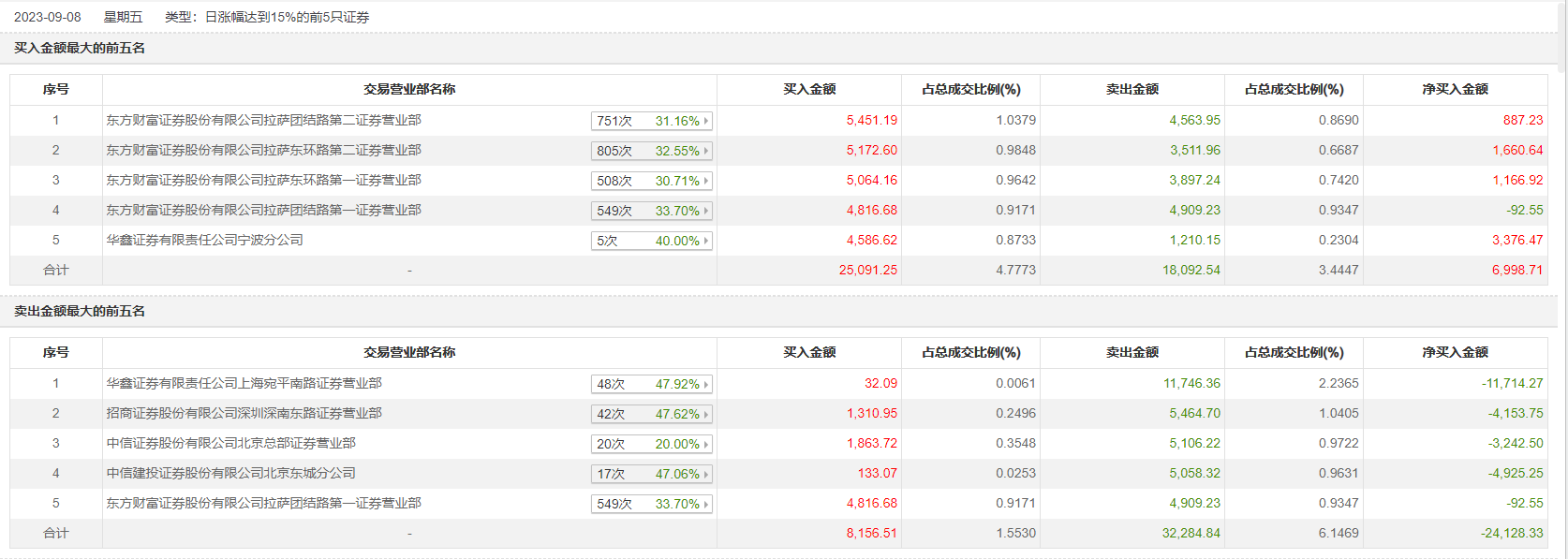 具体来看,知名游资现身龙虎榜,东方财富证券拉萨团结路第二证券营业部、东方财富证券拉萨东环路第二证券营业部分别买入5451.19万元、5172.60万元;炒股养家(华鑫证券上海宛平南路证券营业部)、招商证券深圳深南东路证券营业部分别卖出1.17亿元、5464.70万元。