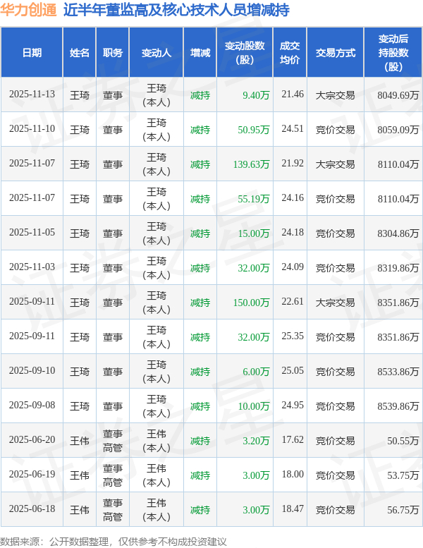 华力创通近半年内的董监高及核心技术人员增减持详情如下: