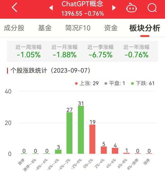 中国经济网北京9月7日讯今日,ChatGPT概念板块整体跌幅0.76%,其中29只股票上涨,1只股票平盘,61只股票下跌。