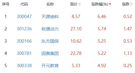 其中,天源迪科、软通动力、东方国信(维权)、因赛集团、开元教育位列板块涨幅前五位,涨幅分别为6.46%、5.74%、5.25%、5.22%、4.92%。
