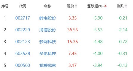 岭南股份、鸿博股份、梦网科技、多伦科技、我爱我家位列涨幅榜后五位,涨幅分别为-5.90%、-5.53%、-4.48%、-4.00%、-3.94%。
