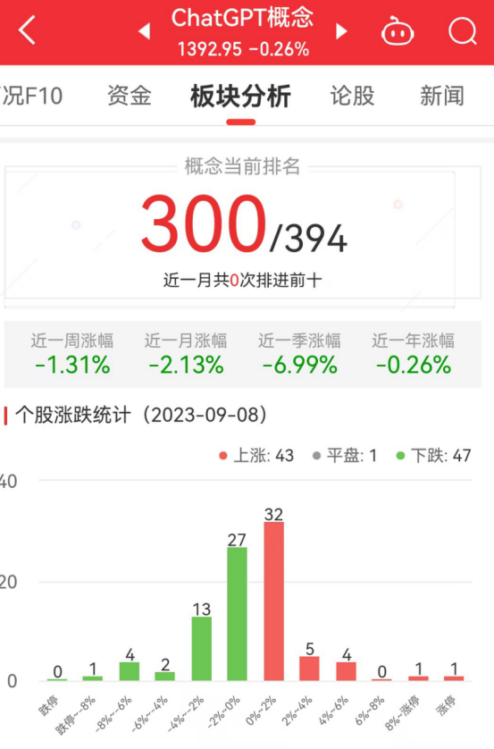 数据显示,截至今日,ChatGPT概念板块近一周涨幅-1.31%,近一月涨幅-2.13%,近一季涨幅-6.99%。