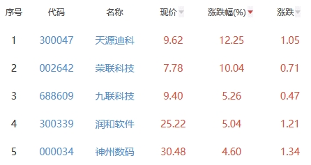其中,天源迪科、荣联科技、九联科技、润和软件、神州数码位列板块涨幅前五位,涨幅分别为12.25%、10.04%、5.26%、5.04%、4.60%。