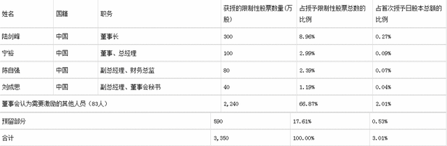 根据本次激励计划,陆剑锋获授限制性股票数量为300万股,居于首位;宁裕获授100万股,位列第二。以2025年9月28日收盘价6.36元/股计算,上述股票市值分别为1908万元与636万元。